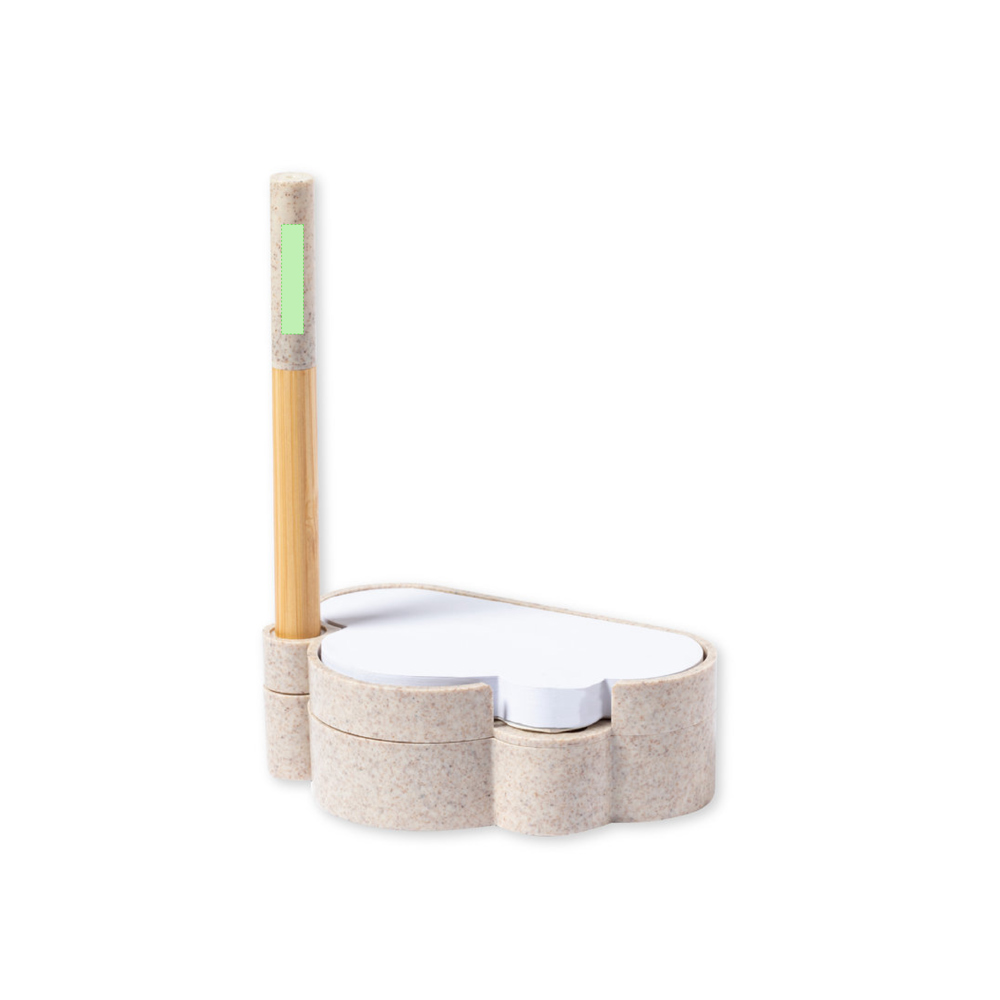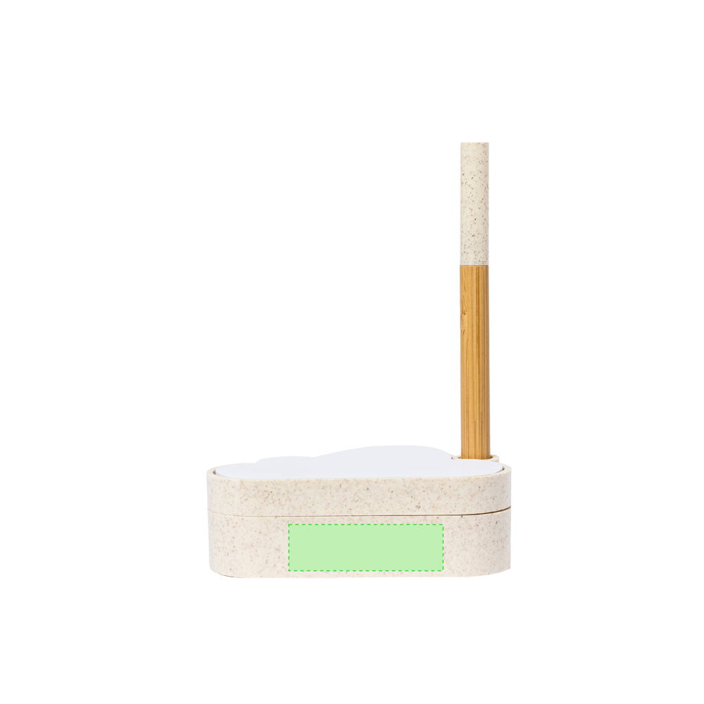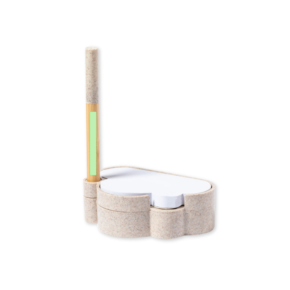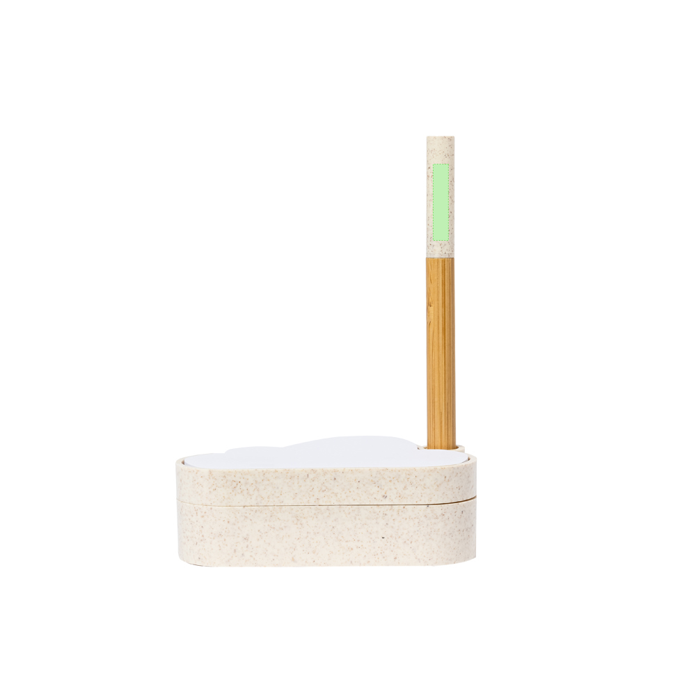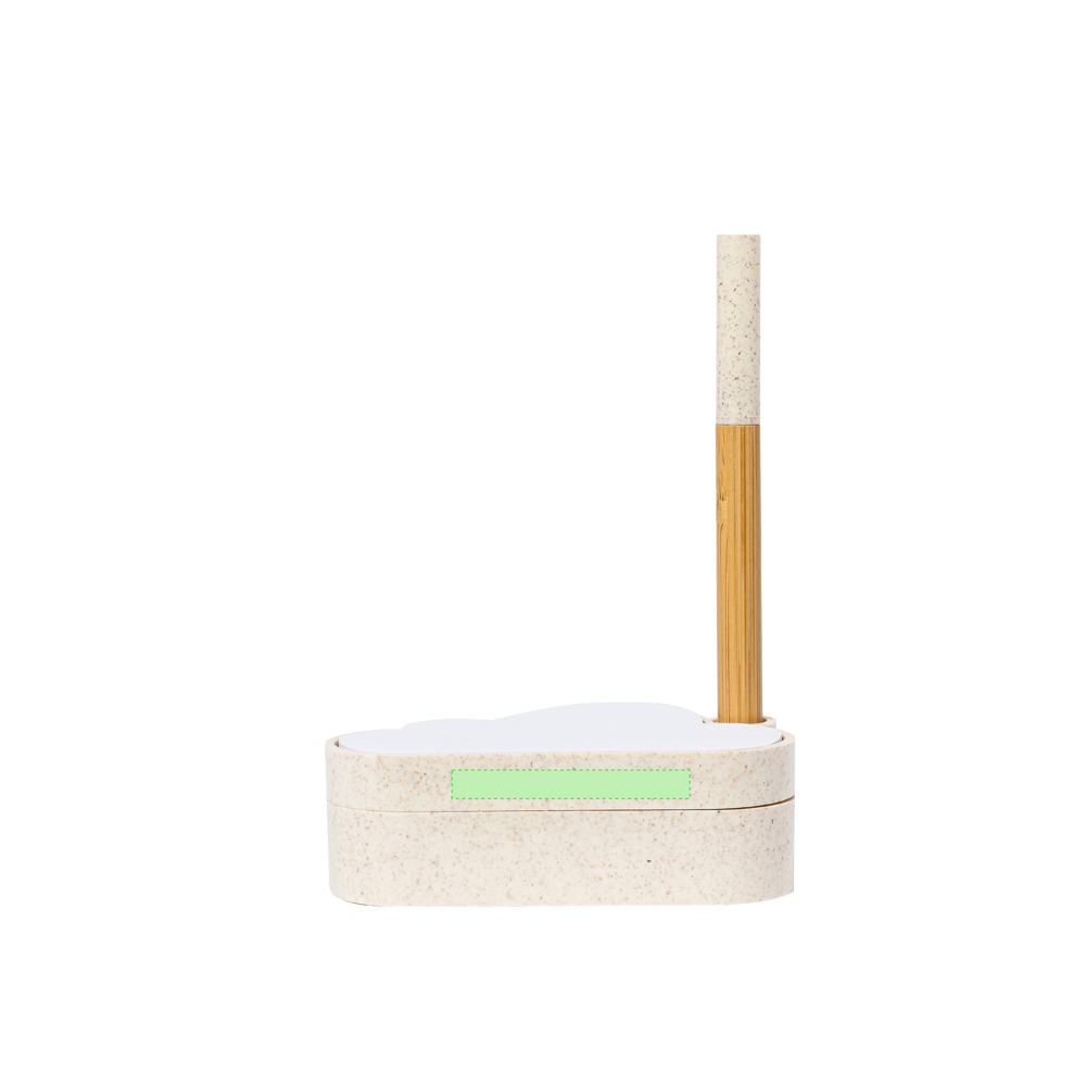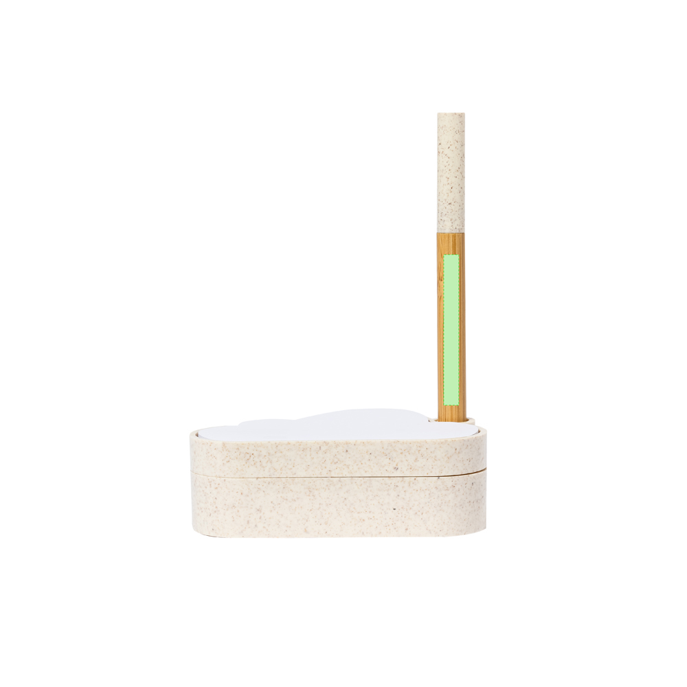 Linie Natur Samen-Notizblockhalter mit originellem Wolkendesign. Enthält:Notizblock mit 80 weißen Zetteln in Form einer Wolke.Sockel mit Stiftehalter und zwei Fächern, inklusive einem Blatt Saatgutpapier.Hergestellt aus Weizenstroh, um die Verwendung natürlicher Rohstoffe zu fördern und Schadstoffemissionen zu reduzieren.Kugelschreiber Pointer mit Bambusgehäuse, Kappe und Details aus Weizenstroh. Mit blauschreibender Tinte.Das Set wird in einer individuellen Design-Kraftbox präsentiert, mit einer Bedienungsanleitung in Englisch und Spanisch.